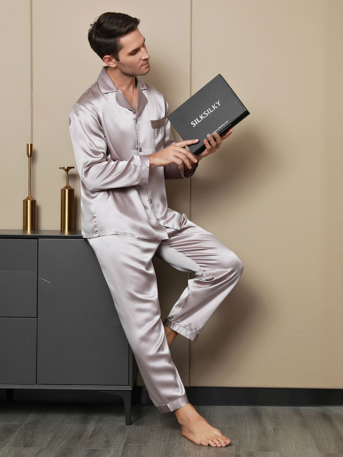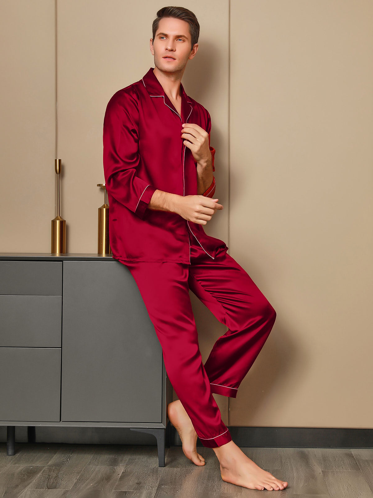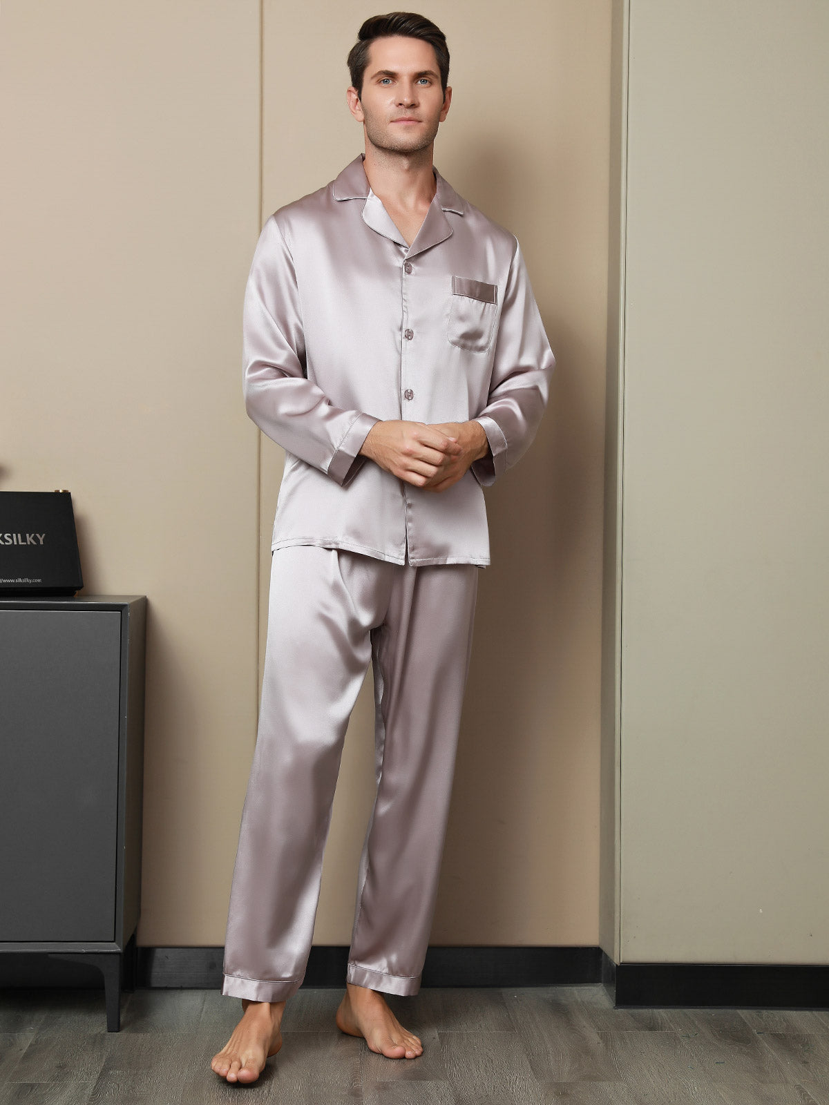 - Classic 2-piece men’s silk pajama set designed for comfort and timeless style.