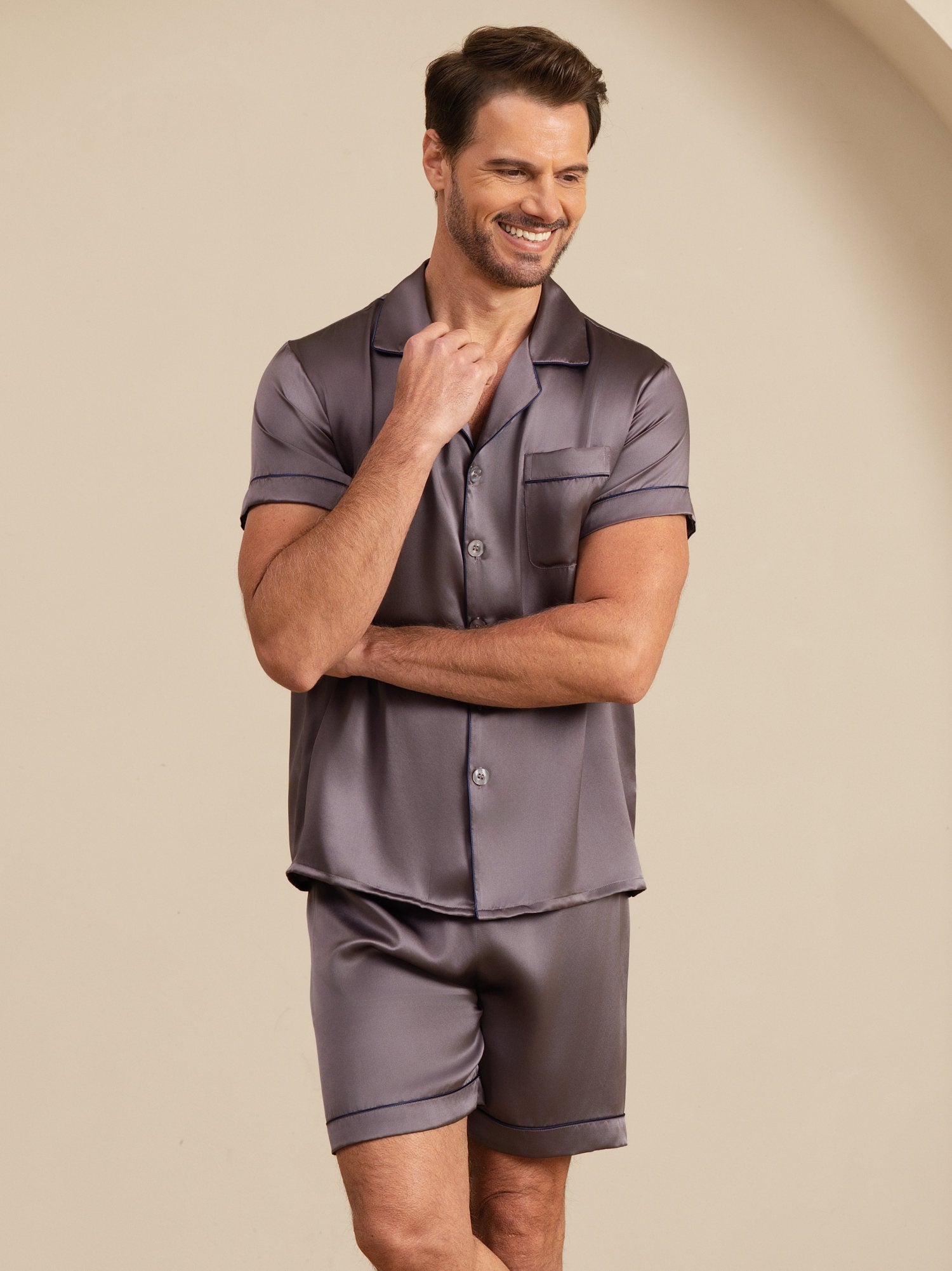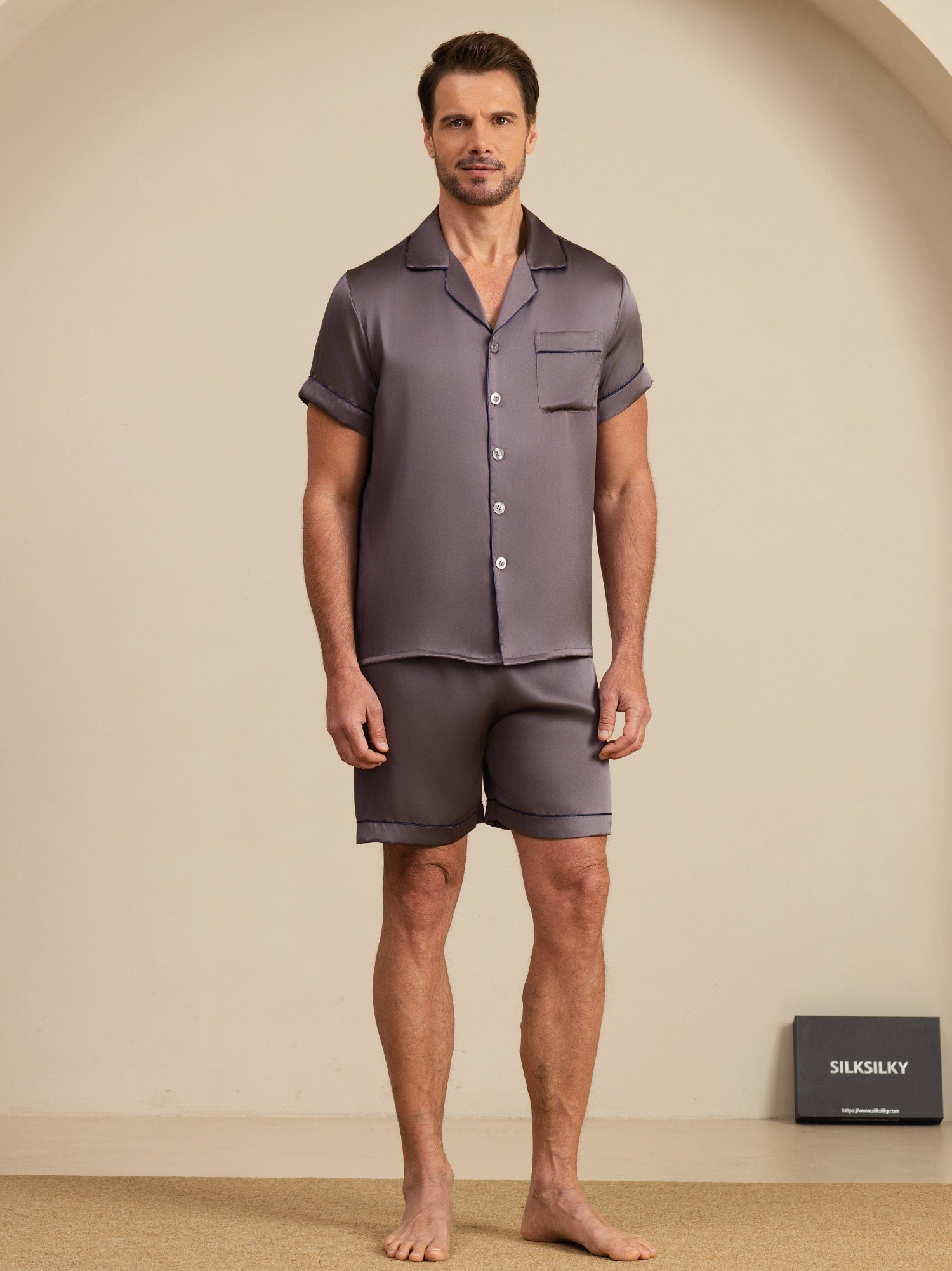 Experience everyday luxury with this men’s mulberry silk short pajama set. Crafted from smooth, breathable silk, the short-sleeve top and lightweight shorts provide exceptional comfort for warm evenings and relaxed mornings at home. Designed with a clean, timeless look, this set blends refined style with effortless comfort.
