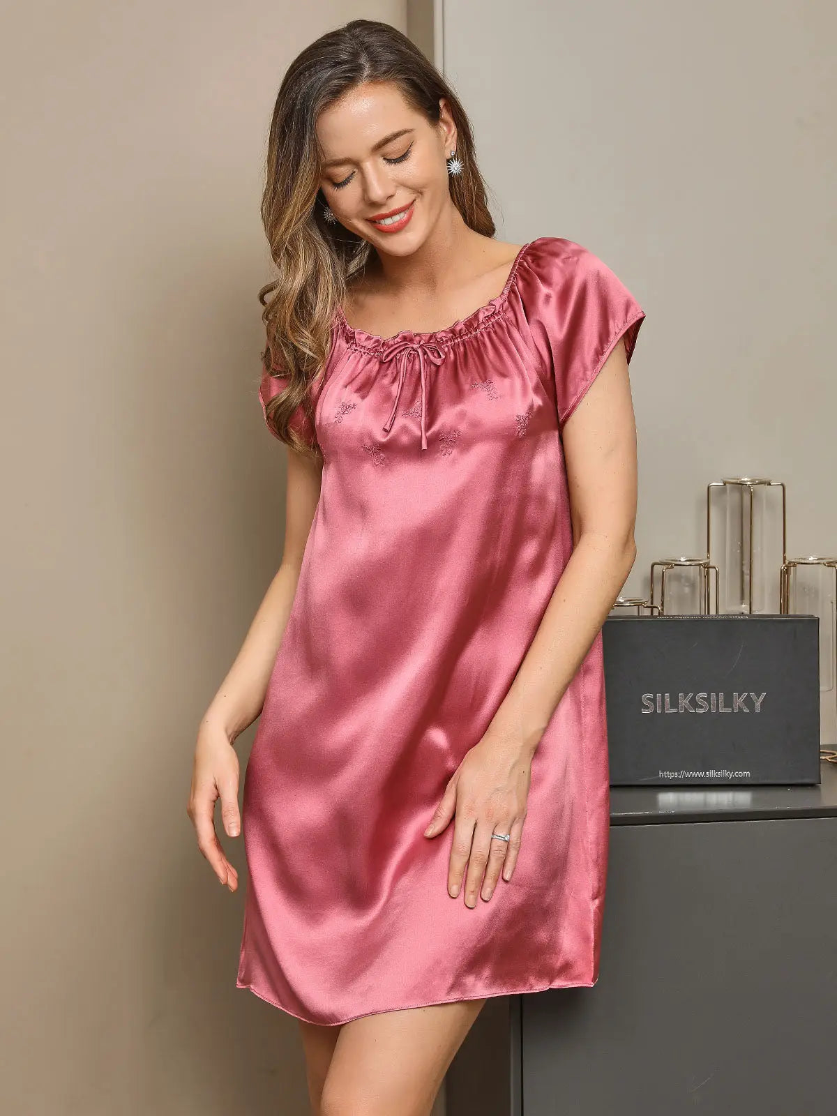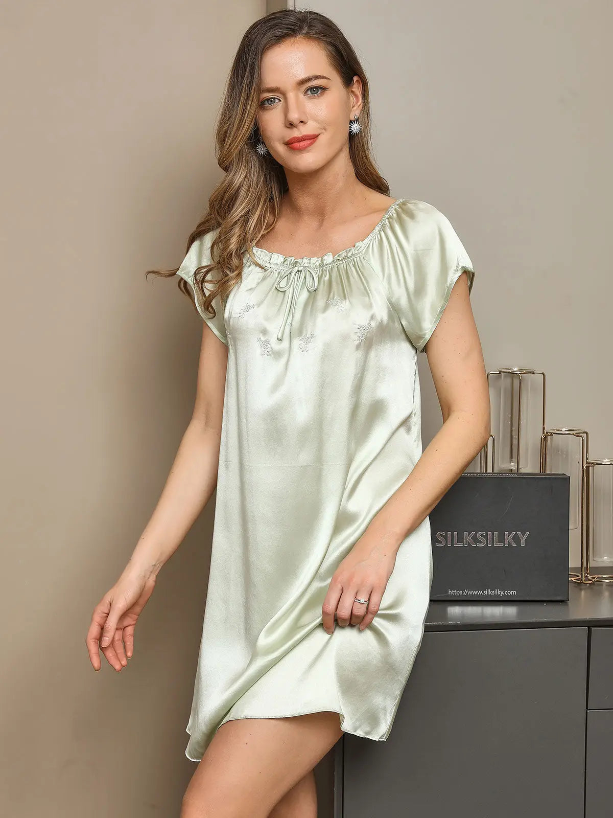 - Details: Crafted from luxurious mulberry silk, this short nightgown features a softly gathered square neckline with an adjustable tie, relaxed cap sleeves, and a flowing silhouette. The natural sheen of silk and its breathable softness create a refined yet comfortable sleepwear piece, perfect for quiet evenings, lounging, or restful nights.